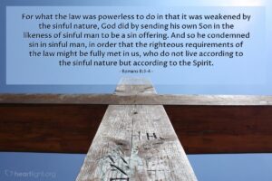For what the law was powerless to do in that it was weakened by the sinful nature, God did by sending his own Son in the likeness of sinful man to be a sin offering. And so he condemned sin in sinful man, in order that the righteous requirements of the law might be fully met in us, who do not live according to the sinful nature but according to the Spirit.