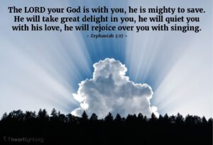 The Lord your God is with you, he is mighty to save. He will take great delight in you, he will quiet you with his love, he will rejoice over you with singing.