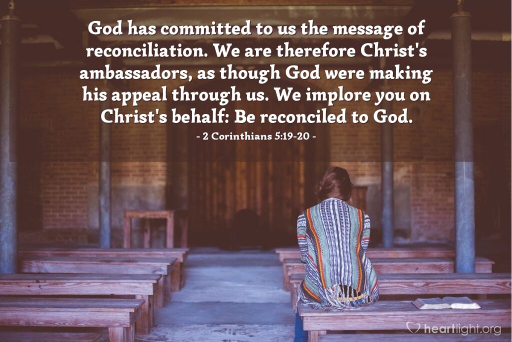 God has committed to us the message of reconciliation. We are therefore Christ’s ambassadors, as though God were making his appeal through us. We implore you on Christ’s behalf: Be reconciled to God.
