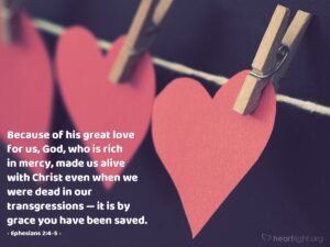 Because of his great love for us, God, who is rich in mercy, made us alive with Christ even when we were dead in our transgressions — it is by grace you have been saved.