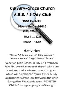 Vacation Bible School 2025 will be next week, July 7-11 from 5 to 7:30 PM.